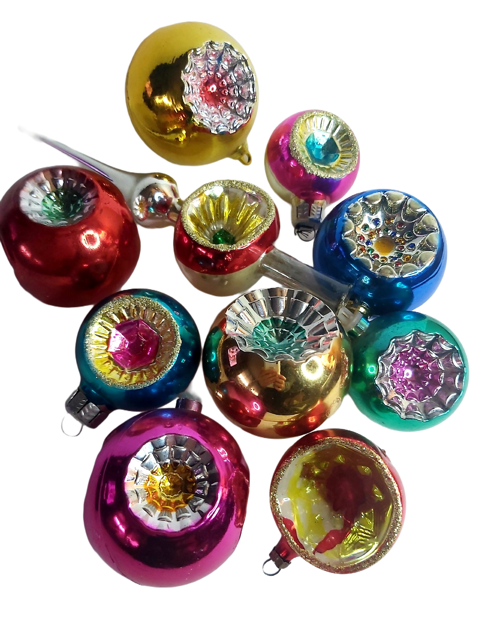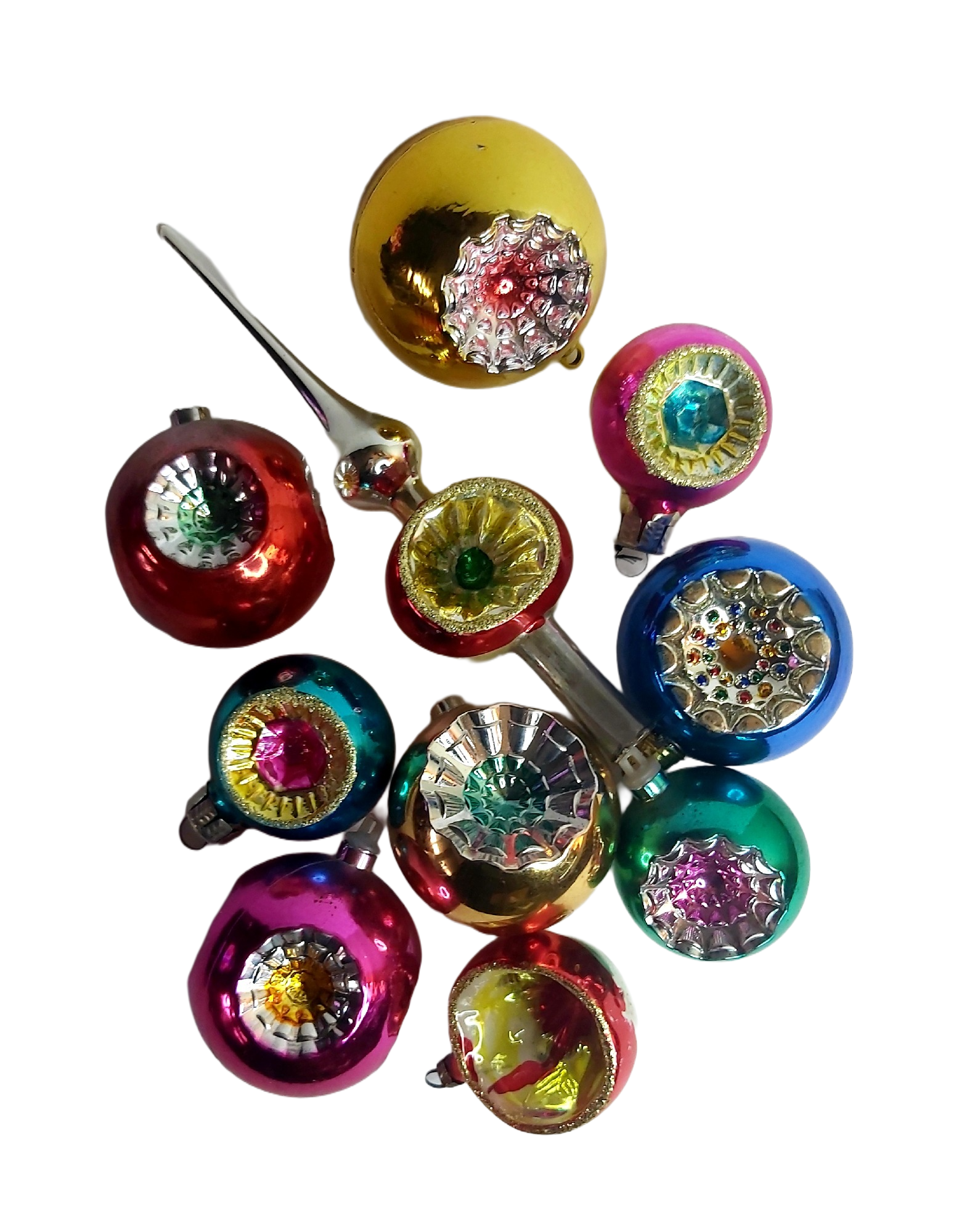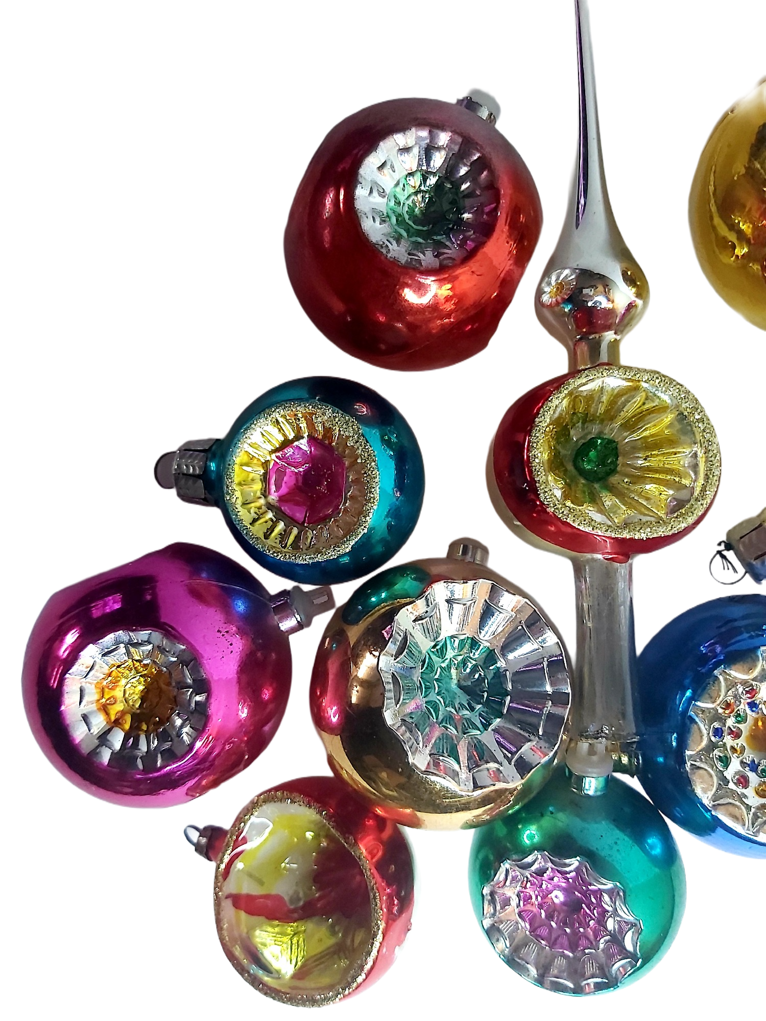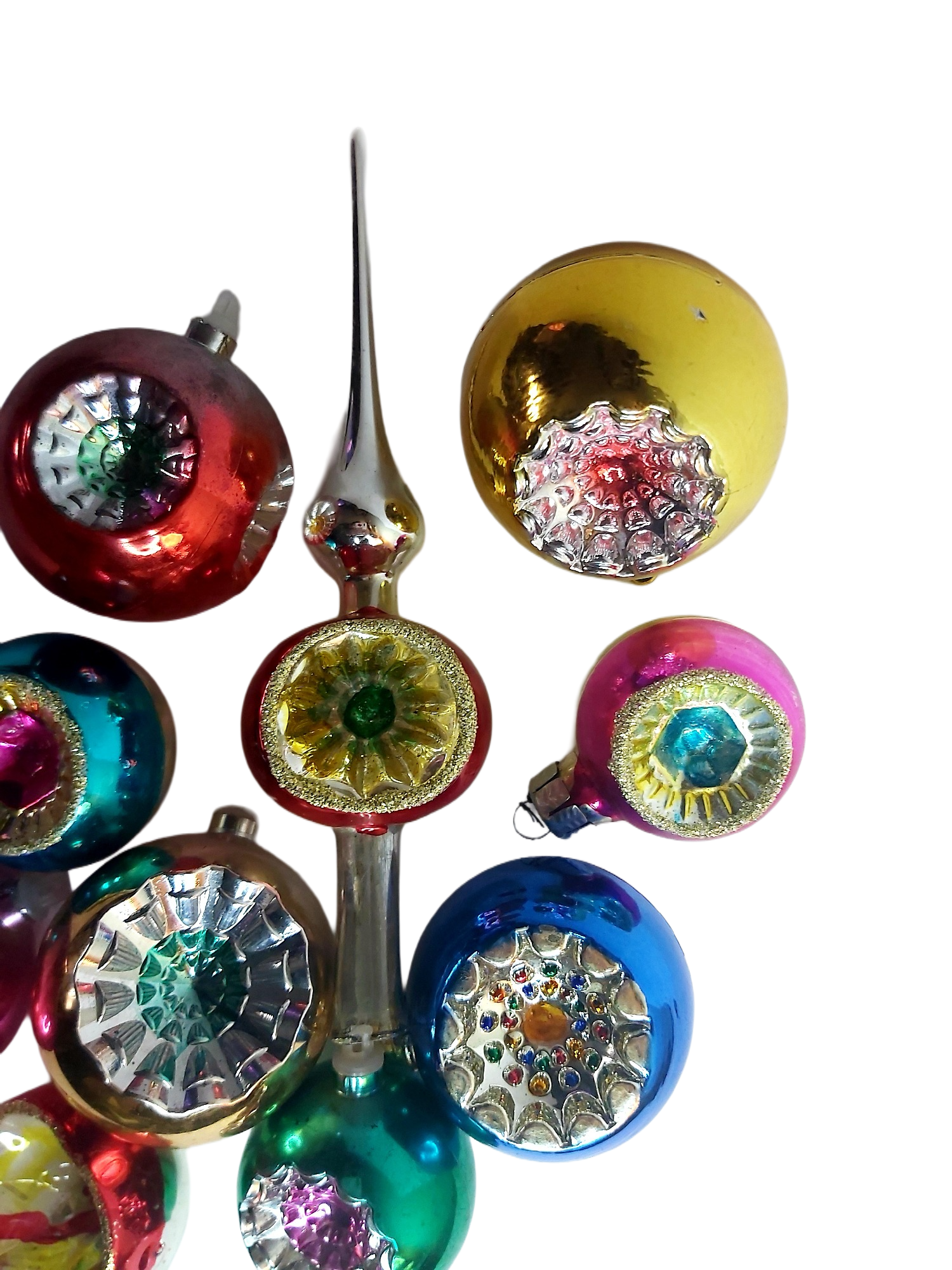 Décoration de Noël des années 70 comprenant un cimier de sapin et 9 boules.