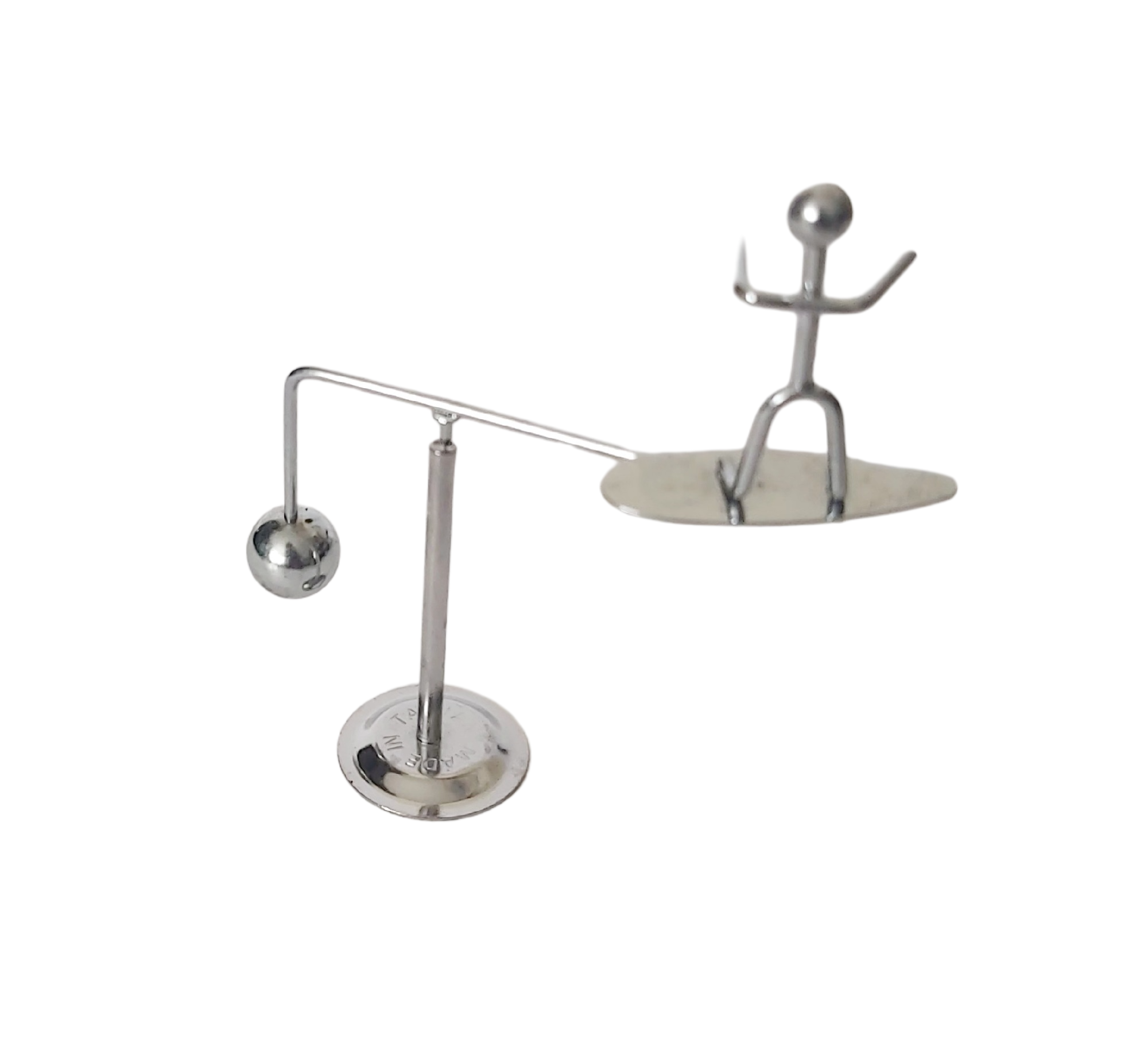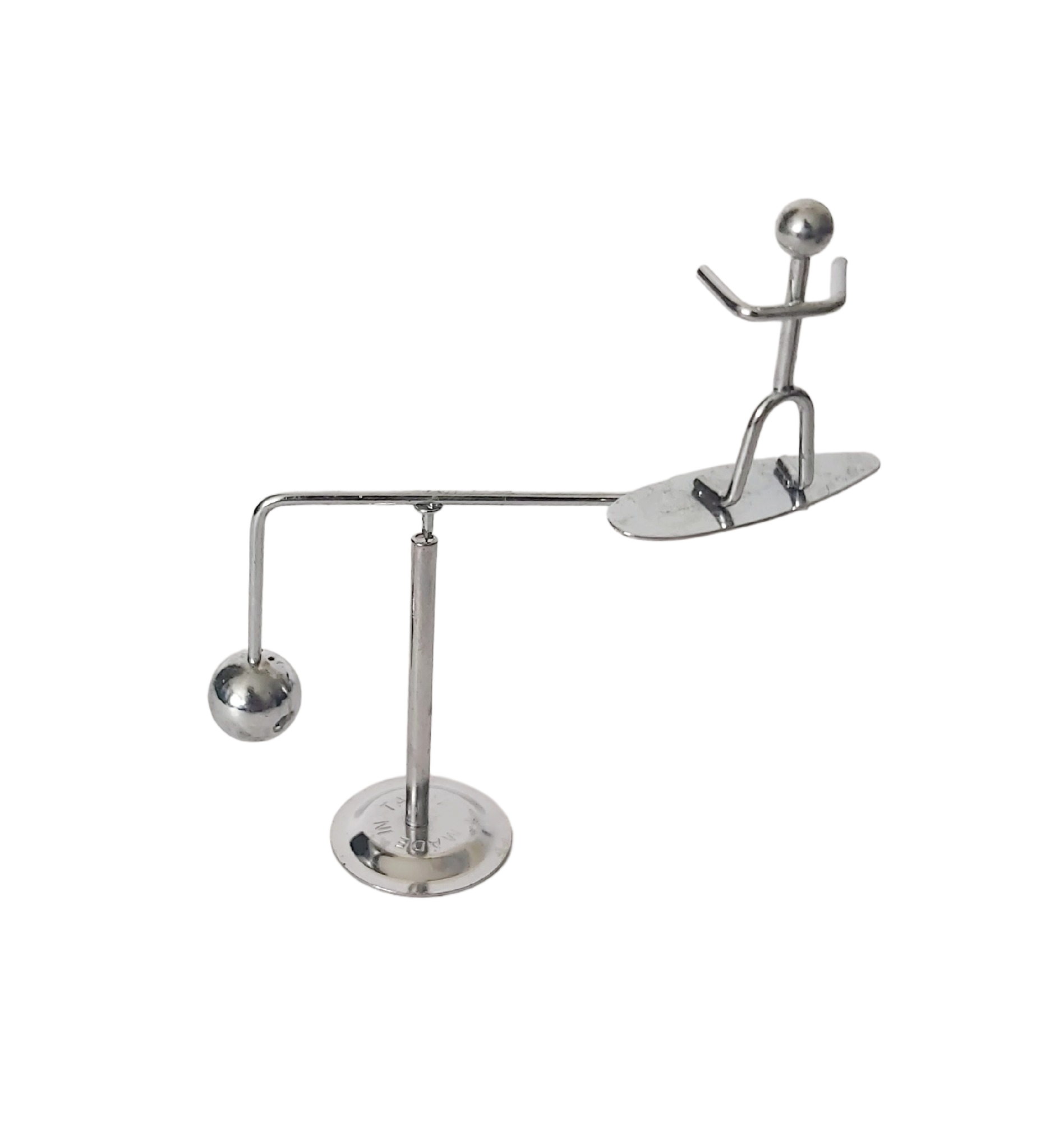 Mobile cinétique d’équilibre représentant un surfer en métal chromé.